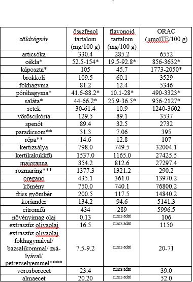 Magyarázat: *: jelentősen függenek a fajtától a mért eredmények, **: ezek, mint egy kevésbé sok fenol- és ORAC-tartalmú zöldségek, mint viszonyítási alap vannak itt feltüntetve, ***: ORAC alacsony, magas fenoltartalommal, **** az elkészítési módokat lásd a szövegben.
