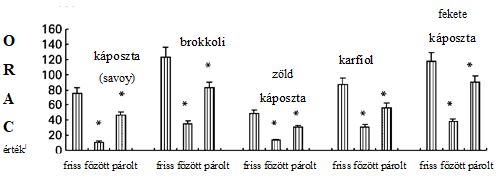 A párolt zöldségek a nyers zöldségek ORAC-értékének körülbelül 80%-át tartották meg, a főtt zöldségek csak 30%-át.